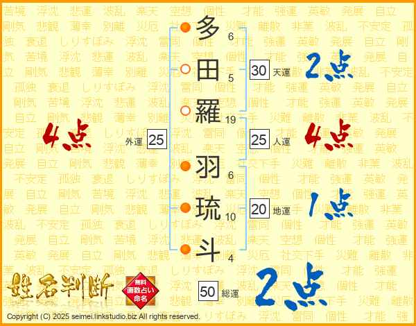 多(6画)田(5画)羅(19画) 羽(6画)琉(10画)斗(4画)