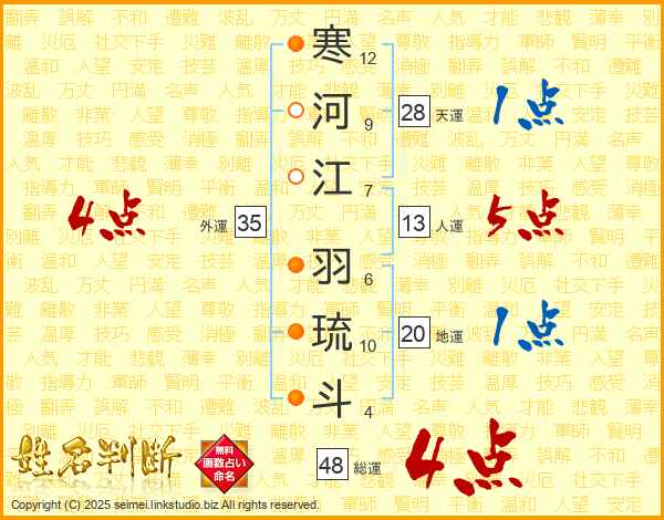 寒河江羽琉斗さんの総運は48画の4点!