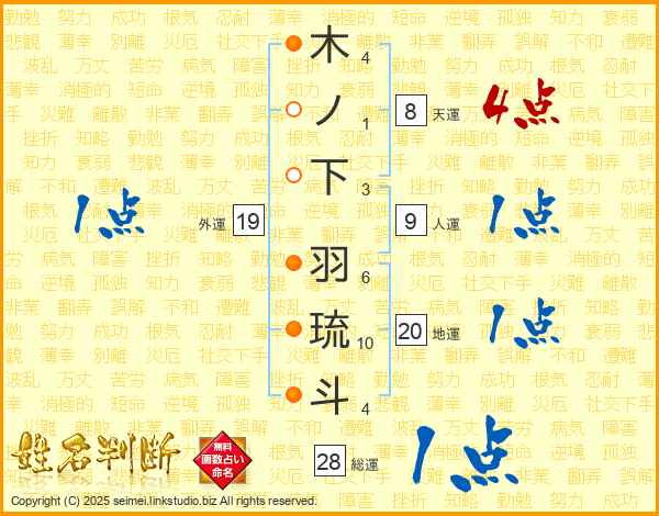 木(4画)ノ(1画)下(3画) 羽(6画)琉(10画)斗(4画)