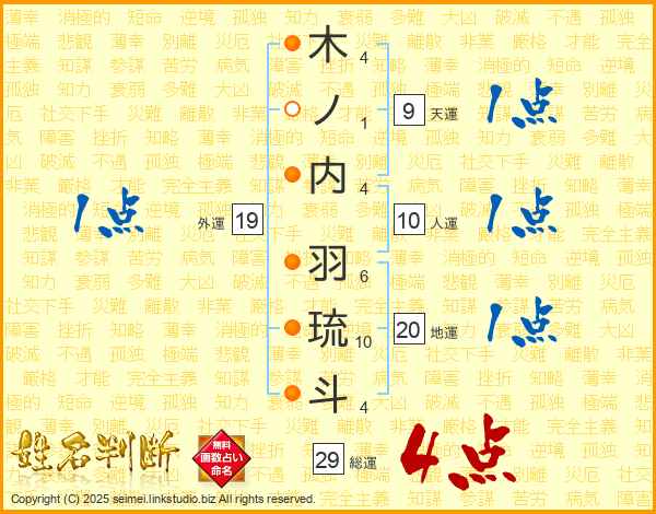 木(4画)ノ(1画)内(4画) 羽(6画)琉(10画)斗(4画)