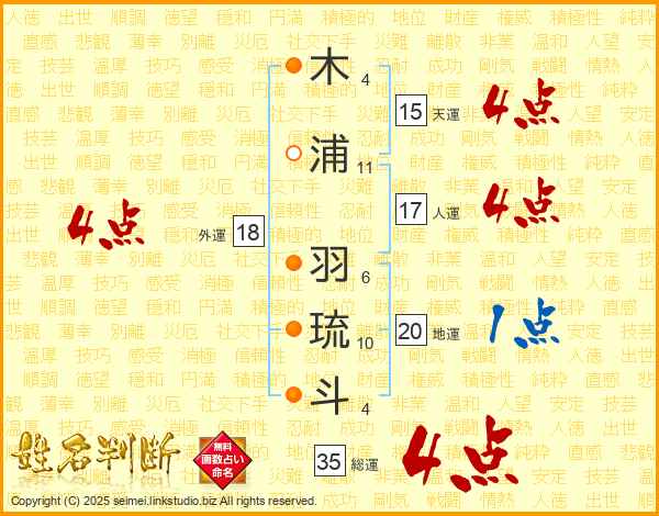木(4画)浦(11画) 羽(6画)琉(10画)斗(4画)