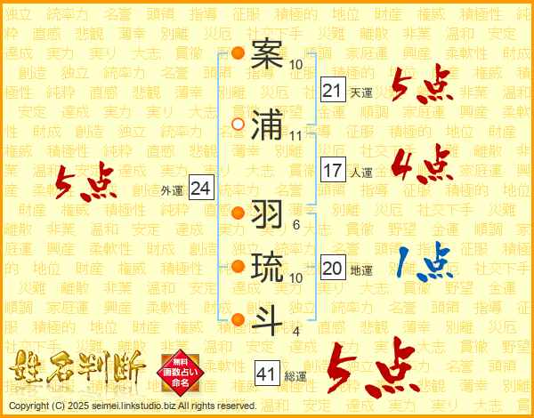 案(10画)浦(11画) 羽(6画)琉(10画)斗(4画)
