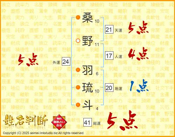 桑(10画)野(11画) 羽(6画)琉(10画)斗(4画)