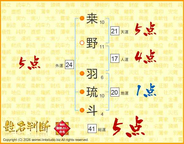 桒(10画)野(11画) 羽(6画)琉(10画)斗(4画)
