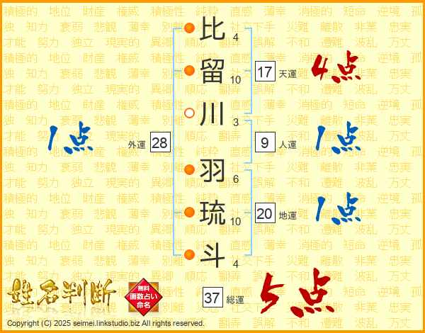 比留川羽琉斗さんの総運は37画の5点!