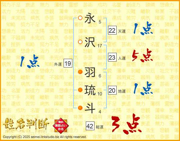 永(5画)沢(17画) 羽(6画)琉(10画)斗(4画)