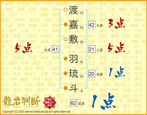 渡嘉敷羽琉斗さんの外運は41画の5点!