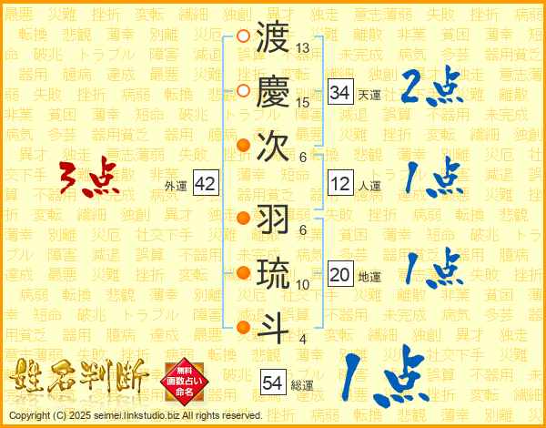 渡(13画)慶(15画)次(6画) 羽(6画)琉(10画)斗(4画)