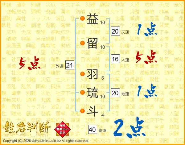 益(10画)留(10画) 羽(6画)琉(10画)斗(4画)