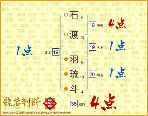 石(5画)渡(13画) 羽(6画)琉(10画)斗(4画)