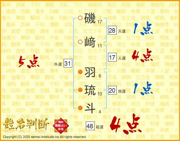磯(17画)﨑(11画) 羽(6画)琉(10画)斗(4画)
