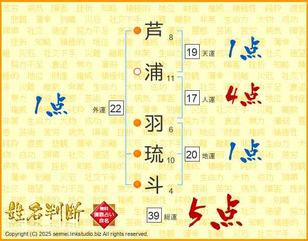 芦(8画)浦(11画) 羽(6画)琉(10画)斗(4画)