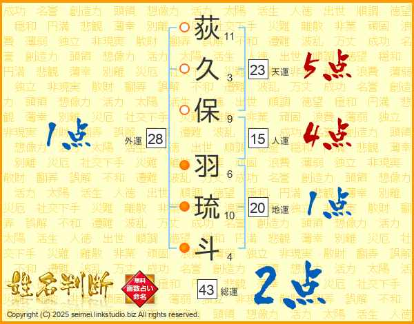 荻(11画)久(3画)保(9画) 羽(6画)琉(10画)斗(4画)