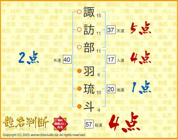 諏(15画)訪(11画)部(11画) 羽(6画)琉(10画)斗(4画)