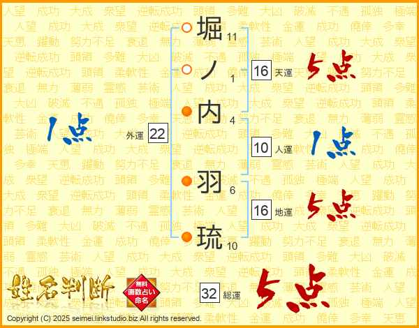 堀(11画)ノ(1画)内(4画) 羽(6画)琉(10画)