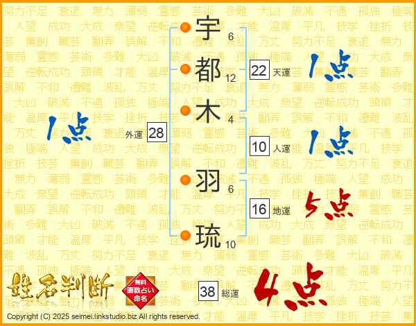 宇(6画)都(12画)木(4画) 羽(6画)琉(10画)