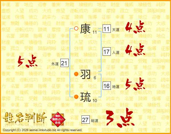 康(11画) 羽(6画)琉(10画)