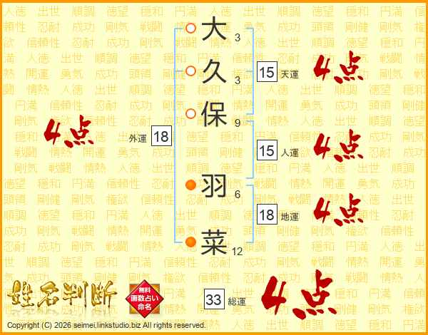 大(3画)久(3画)保(9画) 羽(6画)菜(12画)