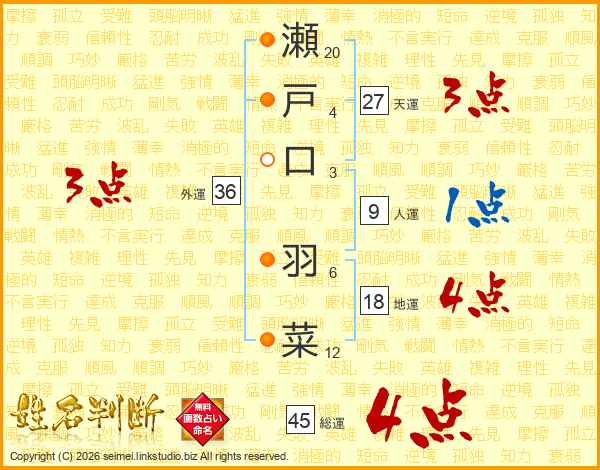 瀬(20画)戸(4画)口(3画) 羽(6画)菜(12画)