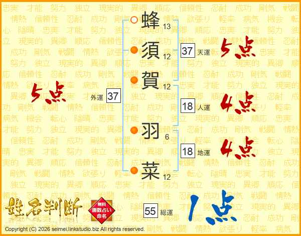 蜂須賀羽菜さんの天運は37画の5点!