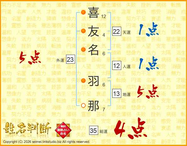 喜(12画)友(4画)名(6画) 羽(6画)那(7画)