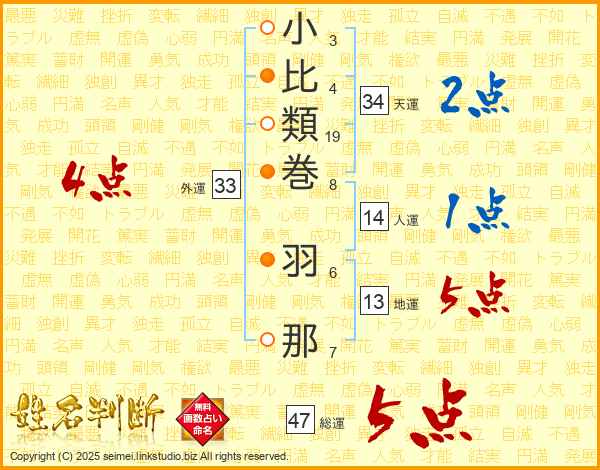 小(3画)比(4画)類(19画)巻(8画) 羽(6画)那(7画)
