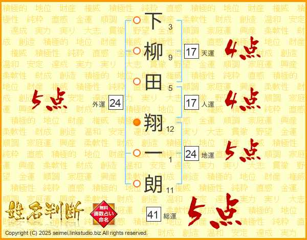 下(3画)柳(9画)田(5画) 翔(12画)一(1画)朗(11画)
