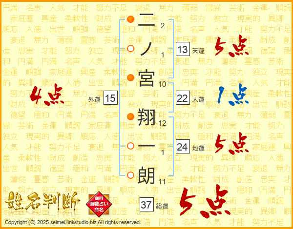 二ノ宮翔一朗さんの総運は37画の5点!