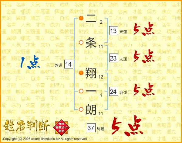 二(2画)条(11画) 翔(12画)一(1画)朗(11画)