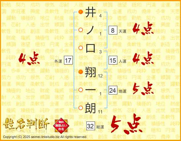 井(4画)ノ(1画)口(3画) 翔(12画)一(1画)朗(11画)