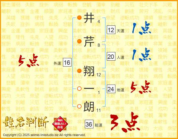 井(4画)芹(8画) 翔(12画)一(1画)朗(11画)