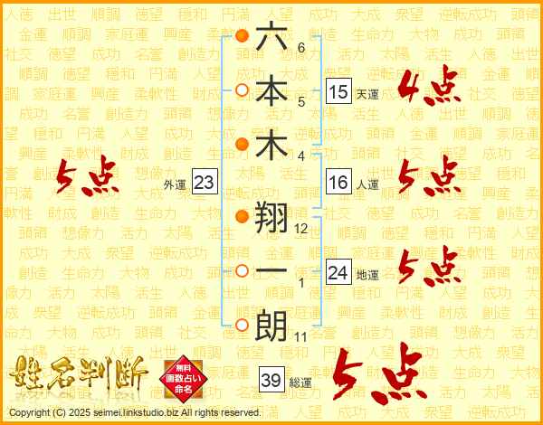 六(6画)本(5画)木(4画) 翔(12画)一(1画)朗(11画)