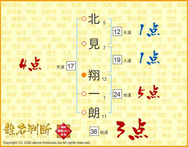 北(5画)見(7画) 翔(12画)一(1画)朗(11画)