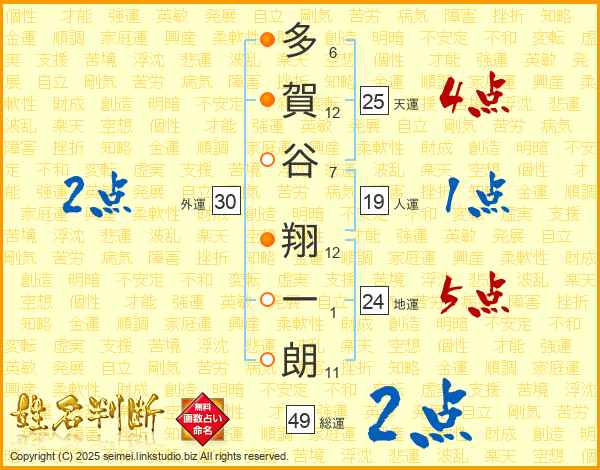 多(6画)賀(12画)谷(7画) 翔(12画)一(1画)朗(11画)