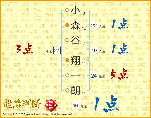 小(3画)森(12画)谷(7画) 翔(12画)一(1画)朗(11画)