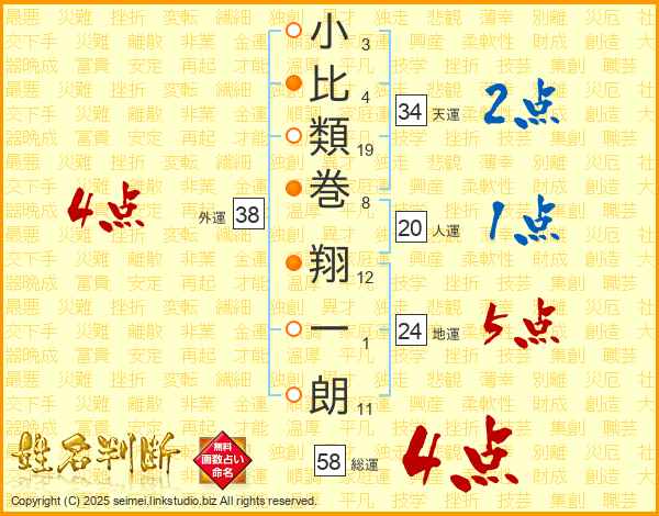 小(3画)比(4画)類(19画)巻(8画) 翔(12画)一(1画)朗(11画)