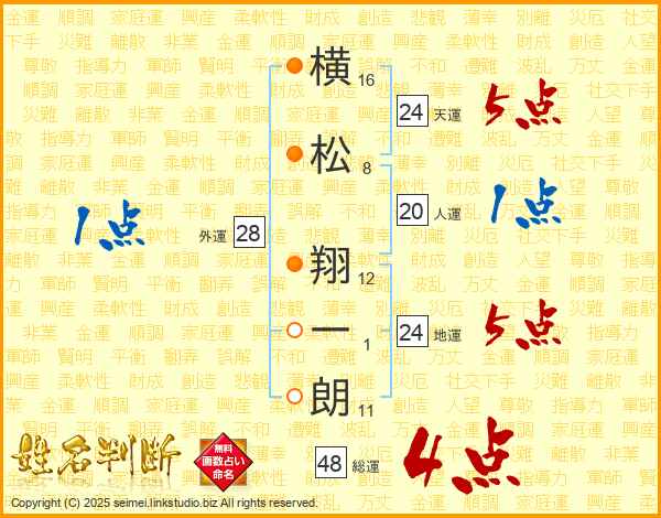 横(16画)松(8画) 翔(12画)一(1画)朗(11画)