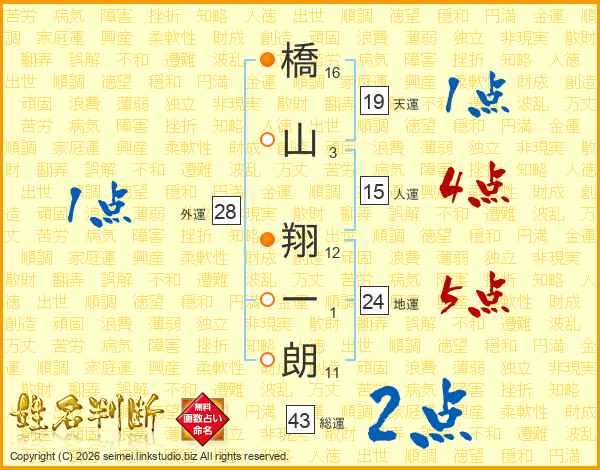 橋(16画)山(3画) 翔(12画)一(1画)朗(11画)