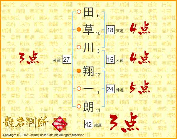 田(5画)草(10画)川(3画) 翔(12画)一(1画)朗(11画)