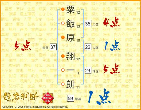 粟(12画)飯(13画)原(10画) 翔(12画)一(1画)朗(11画)