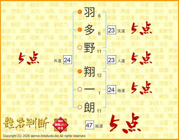 羽(6画)多(6画)野(11画) 翔(12画)一(1画)朗(11画)
