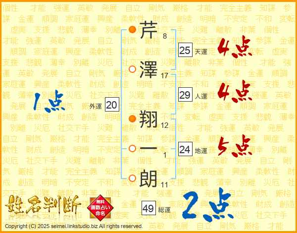 芹(8画)澤(17画) 翔(12画)一(1画)朗(11画)