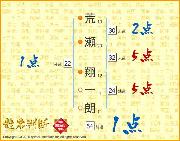 荒(10画)瀬(20画) 翔(12画)一(1画)朗(11画)
