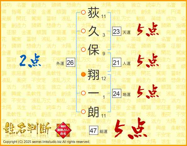 荻(11画)久(3画)保(9画) 翔(12画)一(1画)朗(11画)