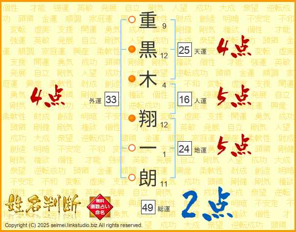重(9画)黒(12画)木(4画) 翔(12画)一(1画)朗(11画)
