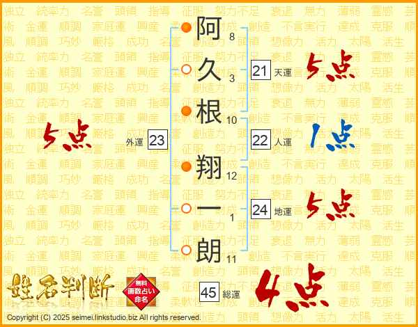 阿(8画)久(3画)根(10画) 翔(12画)一(1画)朗(11画)