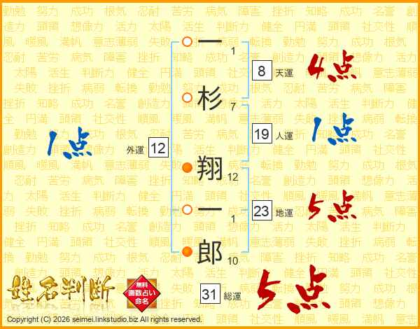 一(1画)杉(7画) 翔(12画)一(1画)郎(10画)