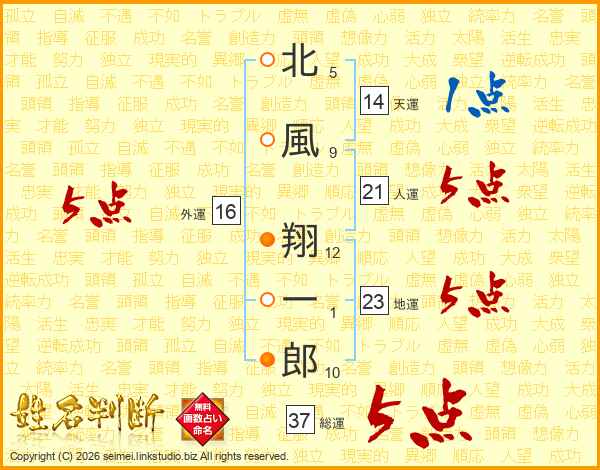 北(5画)風(9画) 翔(12画)一(1画)郎(10画)