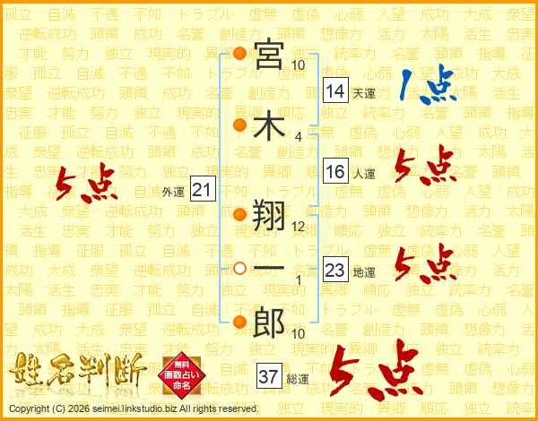 宮木翔一郎さんの総運は37画の5点!