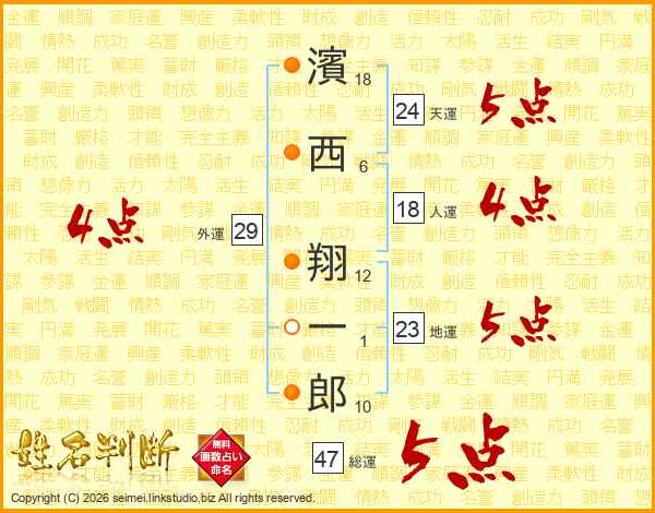 濱(18画)西(6画) 翔(12画)一(1画)郎(10画)